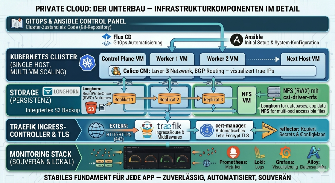 Wer eine private Cloud aufbaut, denkt zuerst an die Apps: Nextcloud für Dateien, Immich für Fotos, Vaultwarden für Passwörter. Das ist verständlich — am Ende des Tages sind es die Anwendungen, die man täglich benutzt. Aber bevor auch nur ein einziger Container läuft, muss ein stabiles Fundament stehen. Netzwerk, Storage, Zertifikate, Monitoring, GitOps-Workflows — all das ist unsichtbar, wenn es funktioniert, und sehr sichtbar, wenn es das nicht tut.
